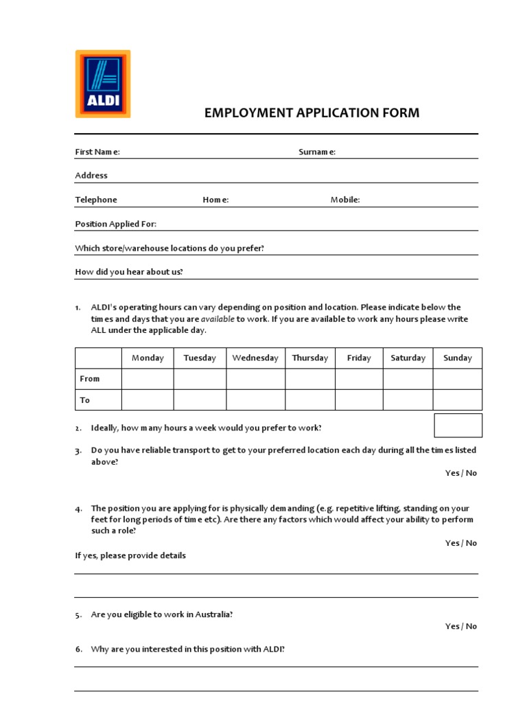 Aldi Job Application Form Free Download