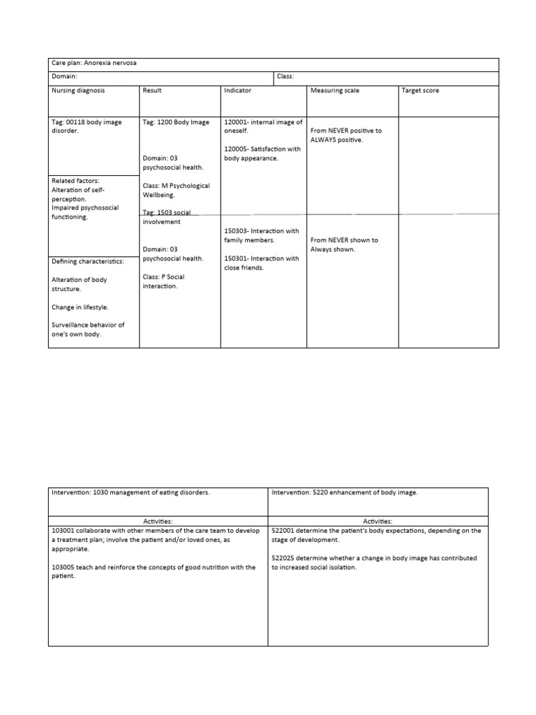 Proper assessment and diagnosis, appropriate interventions, rationales and evaluation. It aims to support patients in their journey towards recovery, promoting physical. A nursing care plan for individuals with anorexia nervosa should encompass interventions.