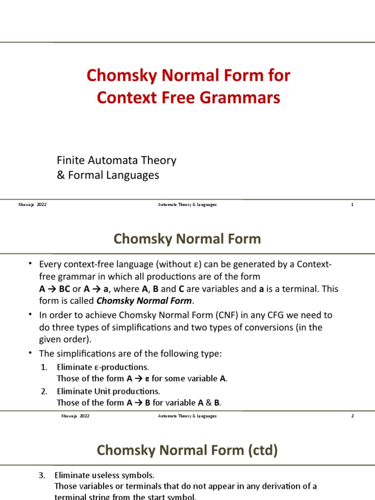 A website to convert context free grammar(cfg) to equivalent chomsky normal form(cnf) A context free grammar (cfg) is in chomsky normal form (cnf) if all production rules satisfy one of the following conditions: Try converting the given context free grammar to chomsky normal form.