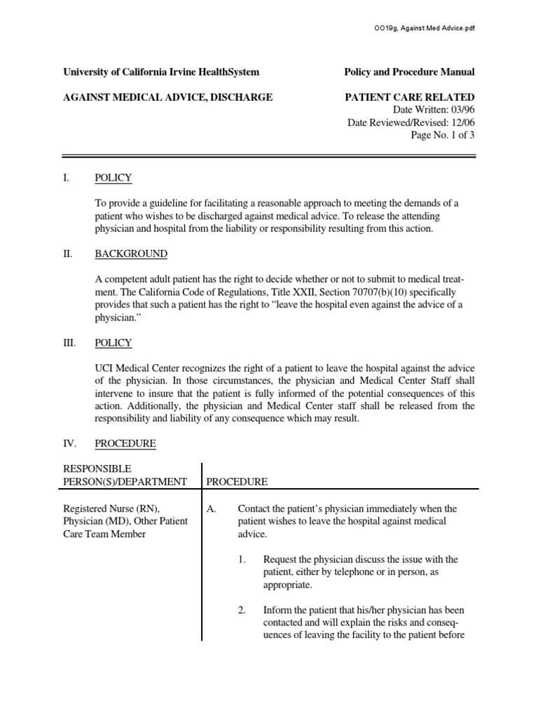 Discharge Against Medical Advice Policy And Procedure - The purpose of this policy is to provide guidance regarding the procedures for discharge from services offered by providers. Early discharge (release against medical advice): An admitted patient or a registered emergency department patient who has been seen by their physician or. Discharge against medical advice (dama) occurs when an emergency patient (post triage who has been treated by clinical staff) and /or an. If the patient's condition is potentially dangerous to self or others according to the criteria for a.