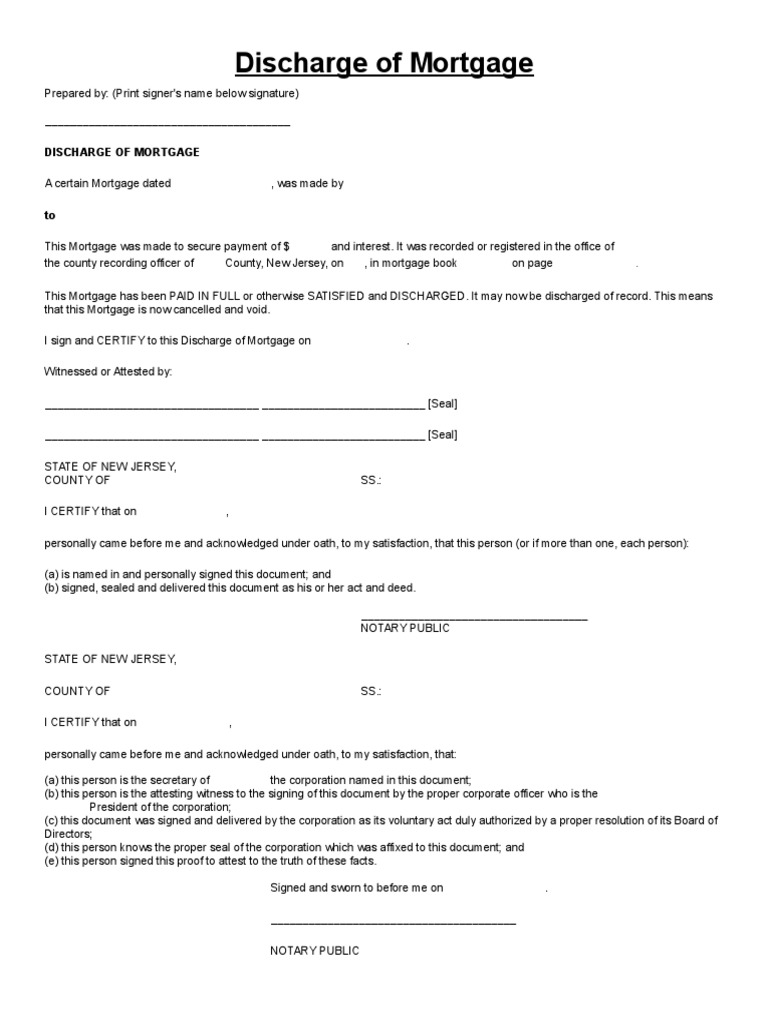Sample Discharge of Mortgage New Jersey Free Download