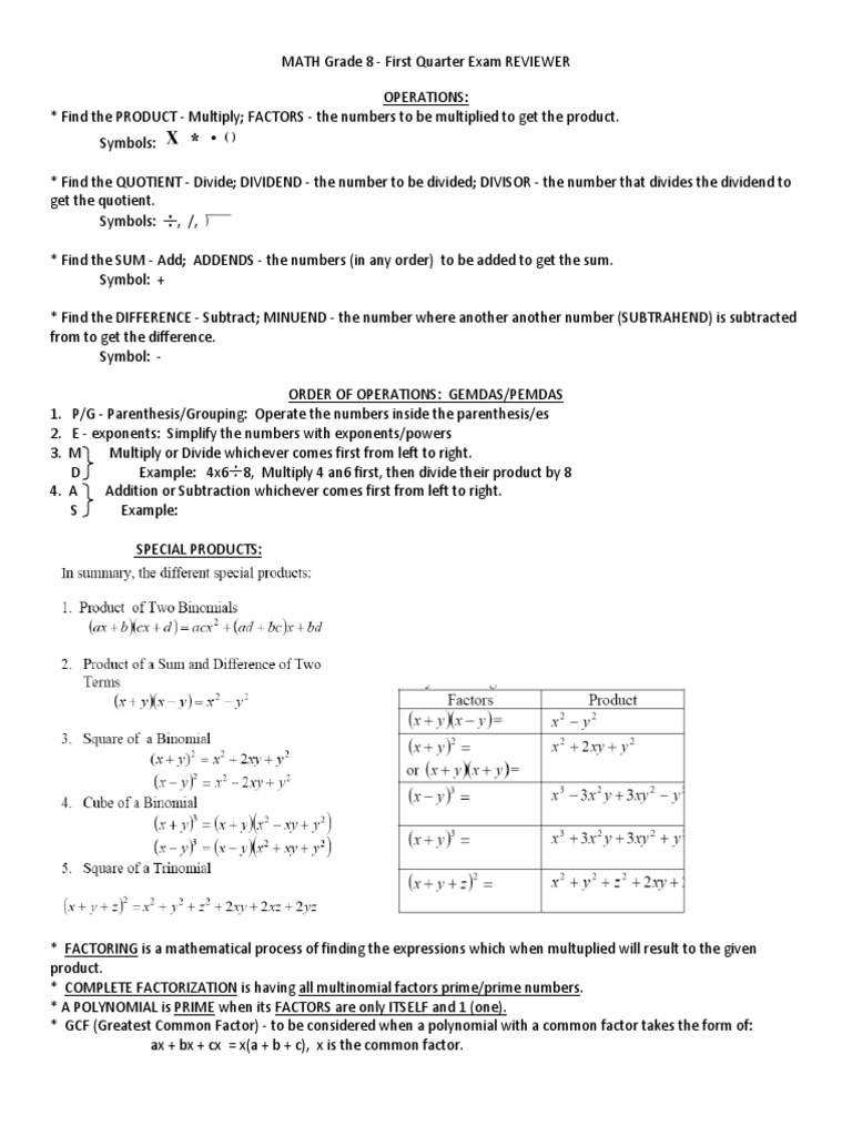 MATH GRADE 8 Part a Factoring and Special Products Factorization